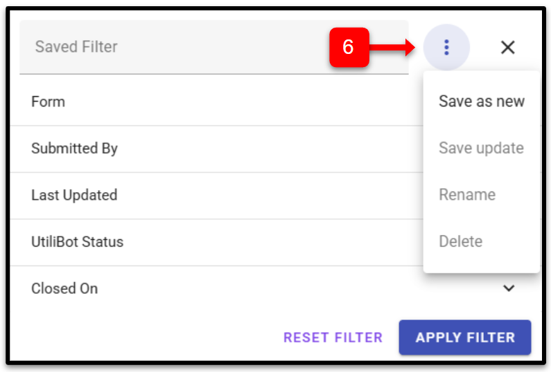 - If you would like to save the filter you just created, click on the three-dot More Options menu by the Saved Filter dropdown and select Save as new.